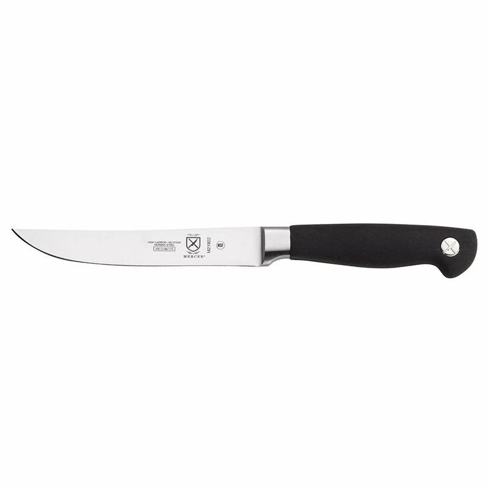 Mercer Genesis Steak Knives are the affordable, professional choice for meat-lovers everywhere! The German stainless steel blades resist rust, corrosion, discoloration, and are of superior high carbon composition for strength and durability. The Mercer steak knife has taper ground, razor-sharp edge that will slice and cut all kinds of meats and poultry. The fully forged steak knives will maintain sharpness and edge longer than those of stamped steel. These knives will give you years of reliable service. This Mercer Genesis Steak Knife is a perfect gift for those that want professional quality with NSF certifications for health and safety. Go warm up that grill and get ready to enjoy a juicy steak with your new Mercer Genesis Steak Knife!