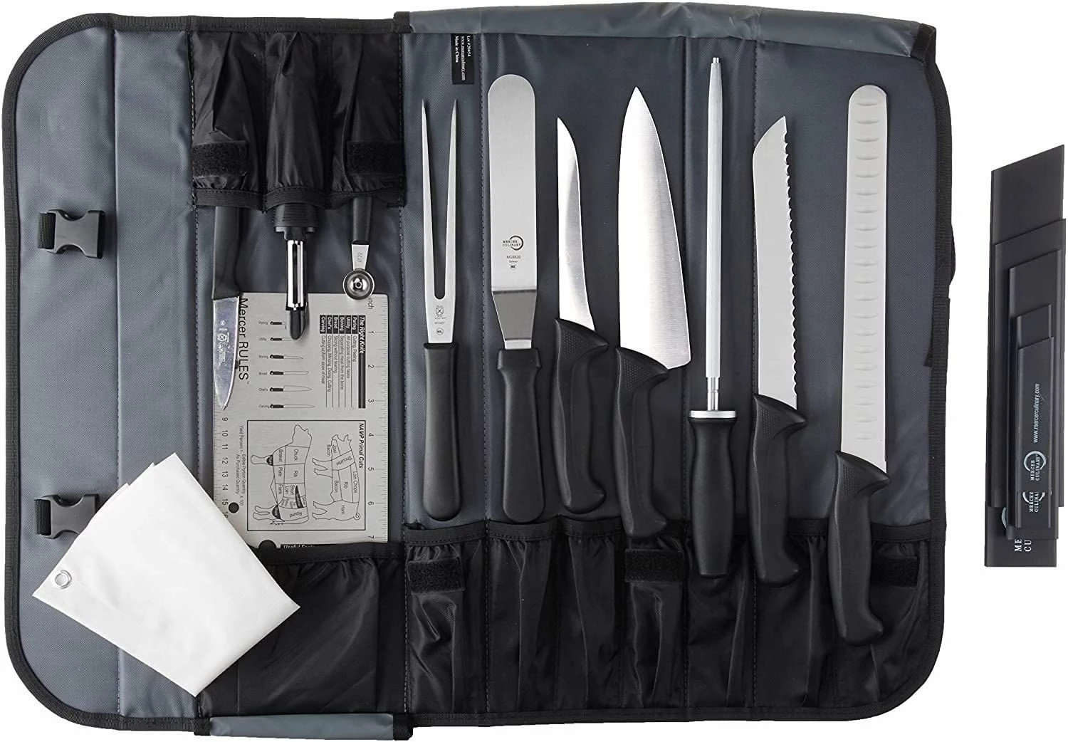 For those looking to improve their culinary prowess, the Mercer Millennia 23-Piece Student Set is a must-have collection of your essential tools. This extensive set includes everything you need to cook anything from basic to gourmet recipes. The set includes five knives, the 11″ Granton edge slicer, 8” Chef’s Knife, 8” Bread Knife, 6” Boning Knife, and 3” Paring Knife, each with a knife guard.