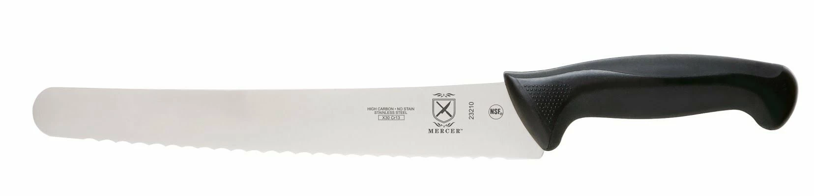 Evenly slice fresh baked breads with Mercer’s Millenniaâ„¢ 10″ Commercial Bread Knife with a Wavy Edge and Wide Blade. The ergonomic handle is designed with Santoprene for comfort and polypropylene for durability. Millenia blades are designed with one piece of high carbon stainless steel, razor-sharp edges, and textured fingers for an innovative design to meet the demands of today’s professional chefs. Â Mercer’s Milleniaâ„¢ 10″ Commercial Bread Knife includes a wavy edge for beautiful, professional cuts that are perfect for restaurant use!