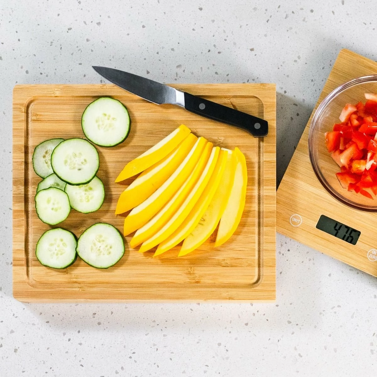 Chop, mince, dice, and slice your ingredients and have a nifty digital scale available to measure out your ingredients with the NutriMill Small Cutting Board & Scale! Made from bamboo, which is environmentally sourced, the cutting board & scale are here to make everything you see important in a cutting board the highest priority. The bamboo construction has antibacterial properties that allow for a more hygienic space for preparing meats, vegetables, and more. The digital scale actually nests with the cutting board to save you space in your cabinets or racks, and it turns on simply with a quick tap. It measures in both ounces and grams, and it has a capacity of up to 185oz or 11.5lbs. The scale also features a TARE feature to reset the scale to zero, automatically subtracting the weight of the bowl or plate from the measurement. Included with your Small Cutting Board & Scale is one lithium battery, so you’ll be immediately ready to measure without delay. When you are done using both cutting board and scale, please hand wash the cutting board and wipe clean the scale separately. Exact measurements and easy meal prep are possible with the help of the NutriMill Small Cutting Board & Scale ready at your side!