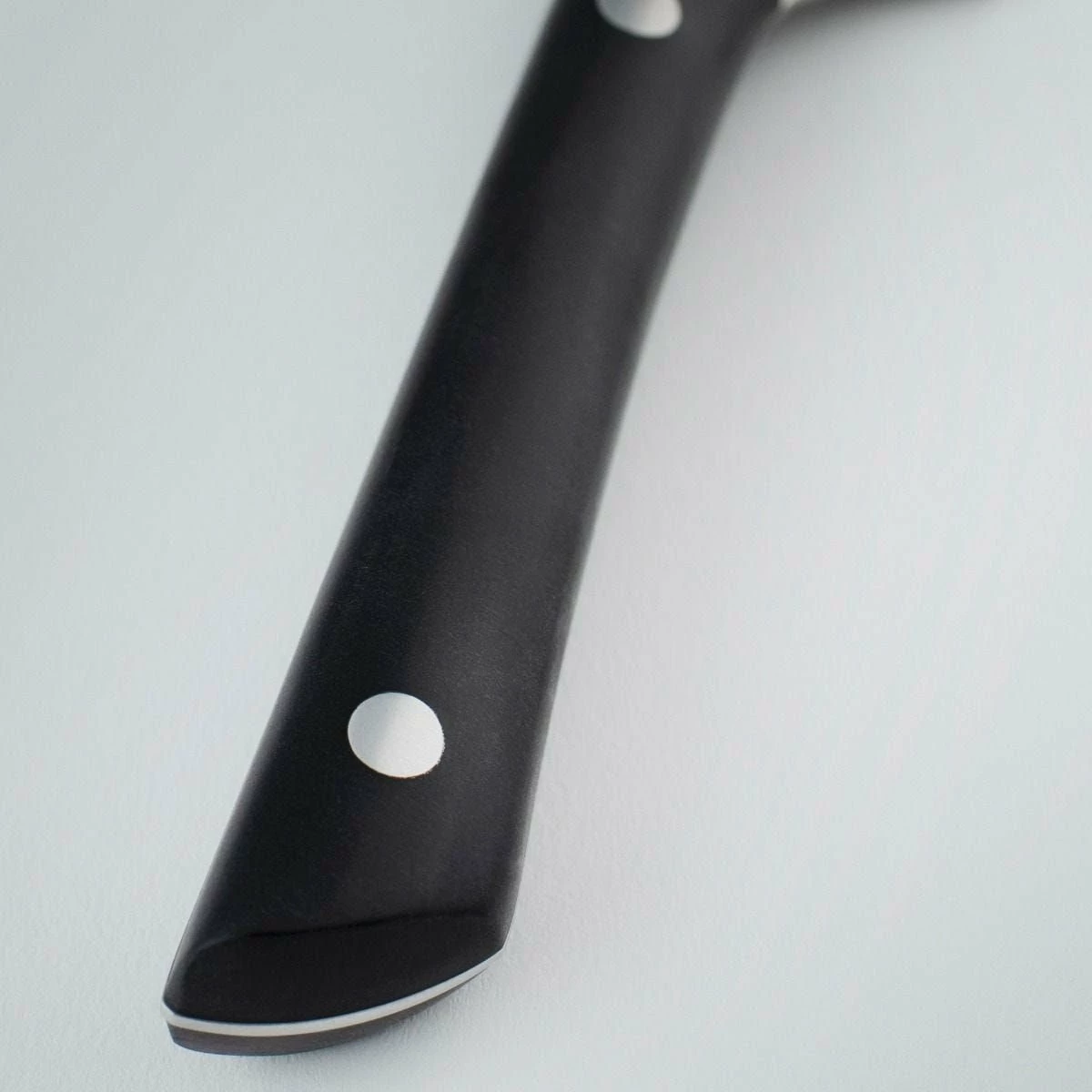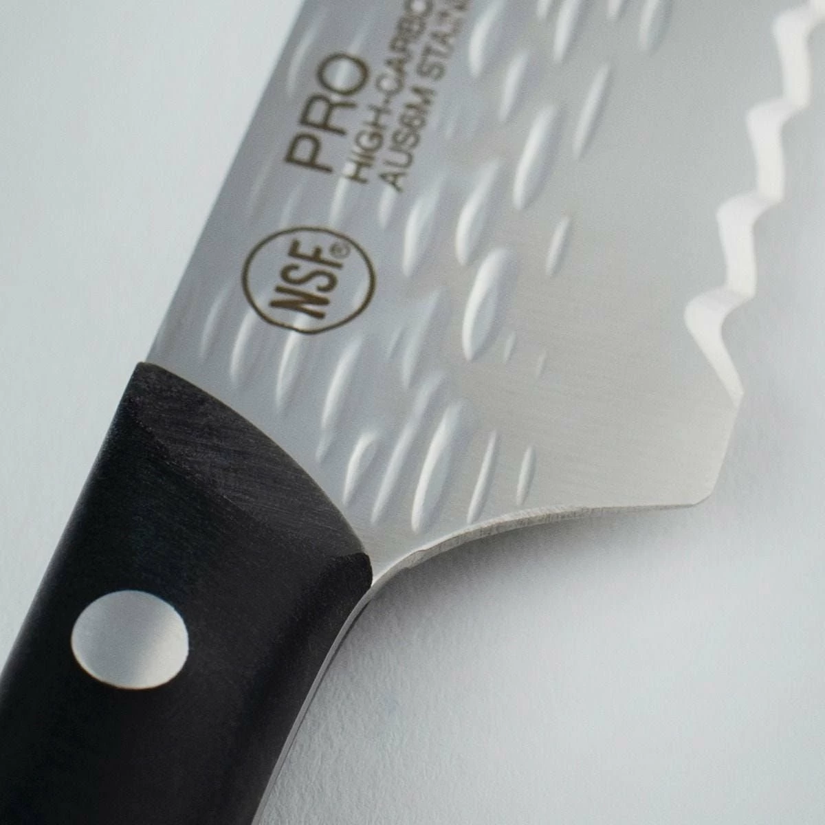 NSF-certified for use in commercial kitchens, Kai PRO knives are made of Japanese AUS6M high-carbon stainless steel and hand sharpened to a 16° edge on each side. Full-tang with a double-riveted handle, the PRO series knives are built to stand up to daily, professional use. The striking hammered blade finish is more than just beautiful; it reduces drag and helps food release from the blade easily. With a limited lifetime warranty, you can count on the precision performance this Kai PRO knife will bring to your prep work.