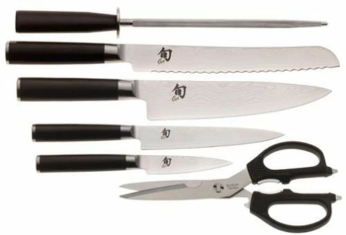 - Includes 4 blades, 1 pair of shears, 1 honing steel, and a bamboo block from the Shun Classic line