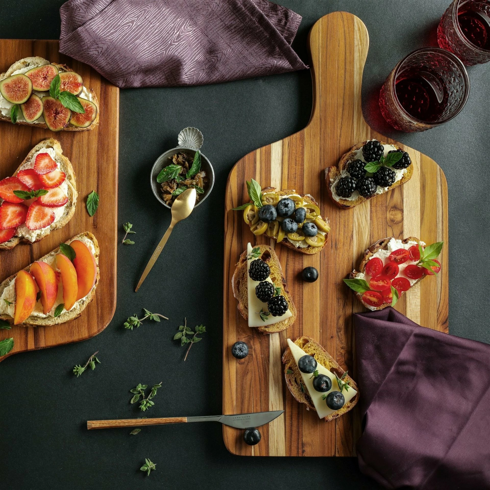Prepare, serve, and share delicious appetizers with the Medium Paddle Board by TeakHaus! From the Marine Collection that features pieces designed to seamlessly transition from cutting and prep boards to stylish serving boards, this medium paddle board has a 20” x 10” surface that’ll give you plenty of room to cut and craft an elegant display of charcuterie, appetizers, and more. Crafted from FSC®-certified, stain-resistant teak wood that’ll never dull your knives, this handy board features a large rounded handle for easy transportation around the kitchen. For a dynamic addition to your kitchen collection, try the Medium Paddle Board by TeakHaus today!