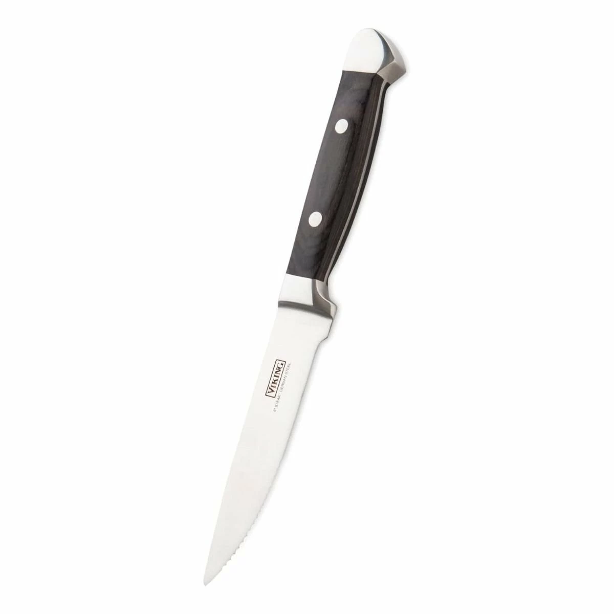 One of the greatest pleasures in life is enjoying a steak dinner, especially with your loved ones celebrating a birthday, a new job or promotion, or any special occasion. But a great steak dinner experience is nothing without quality blades for the best cuts. Before you enjoy steak, consider the Viking 6-Piece Steak Knife Set with Box in Black to help you slice into gorgeous and marbled cuts. Made from high-quality 18/10 German stainless steel, these 5″ corrosion and stain-resistant knives feature a partially serrated edge to help grip the meat and cut through it without tearing or shredding the fibers of the steak. Each knife fashions a dashing black pakkawood handle, making them water and stain-resistant, which are then double-riveted around the full-tang construction with bolster, resulting in extraordinary balance, comfort, and control. Included with this set is a beautiful rubberwood gift box for easy and safe storage. When you are done using these knives, Viking recommends that you wash them by hand. When steak is back on the menu, the Viking 6-Piece Steak Knife Set with Box in Black will ensure your steak dinner is perfect and painless.